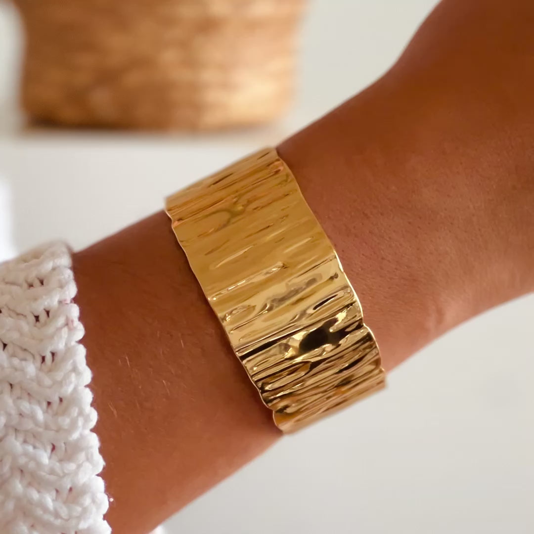 La manchette Sandy se distingue par son large ruban doré au fini martelé, qui crée de subtils reflets à chaque mouvement. Conçue en acier inoxydable doré , elle associe solidité et brillance durable. Sa texture irrégulière apporte un caractère authentique et raffiné, faisant de cette manchette une pièce forte.